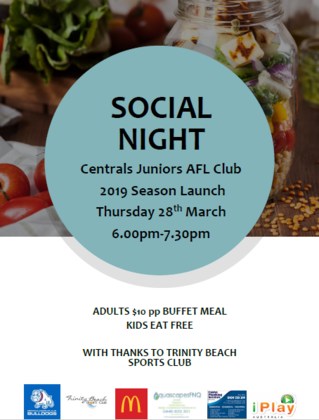 *** SOCIAL NIGHT - SEASON LAUNCH *** Welcoming all Centrals Juniors AFL Players and families to join us for the official Centrals Juniors Club 2019 Season Launch! Buffet Meal for Adults $10 pp Kids Eat Free - meal and drinks provided Jumping Castles, Raffles. Adults meals to be paid for on the night with cash please!