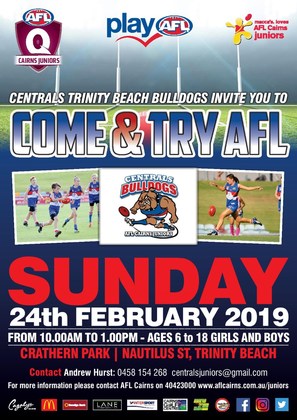 Centrals Juniors AFL Club would like to welcome all members to their annual Presentation Night.   Combined Youth Presentation Night Youth Girls U14's, Youth Girls U17.5, U15.5 and COLTS Sit down dinner with drinks proudly catered for by the Trinity Beach Sports Club   Awards ceremony that includes Rising Star, Most Consistent, Coaches Award and Best and Fairest.   All welcome. Dress Code:  Club Polo mandatory